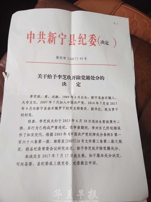 记者在这份中共新宁县纪委《关于给予李芝玖开除党籍处分的决定》中看到,该决定称,李芝玖夫妇2015年6月30日违法生育政策外二孩,行为已构成严重违纪。经新宁县纪委常委会议研究决定,开除李芝玖党籍。