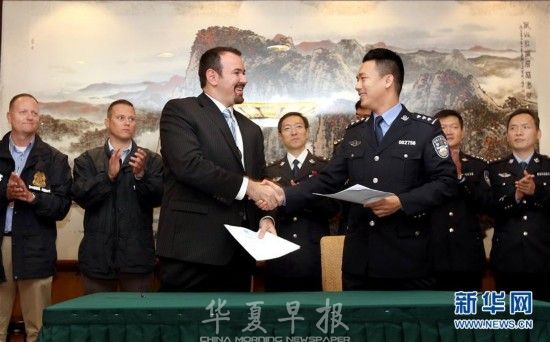 10月16日,公安部国际合作局代表(右)和美国司法部法警局代表签署移交备忘录。