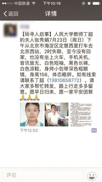 “老婆,快回家吧!我愿用我余生所有的好运,换回你的平安归来。”昨日上午,中国人民大学历史学院老师丁超在朋友圈发布了一条寻人启事,称自己妻子张秀娟于7月23日下午2点失联,被众多网友转发。丁超告诉北青报记者,妻子张秀娟出生于1981年,身高156厘米,体态略胖,现为北京一初中的老师。