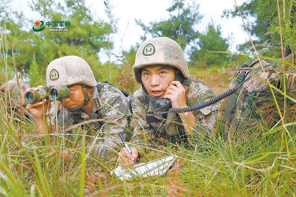 “坐标××,高程××……”陆军第75集团军某旅上等兵石鉴豪运用陆空协同电台向准备临空的空军战机准确报告打击坐标,4分钟后,呼啸而来的歼击机一阵火力急袭,地面目标被摧毁。图为石鉴豪(右)通过电台引导空中火力。