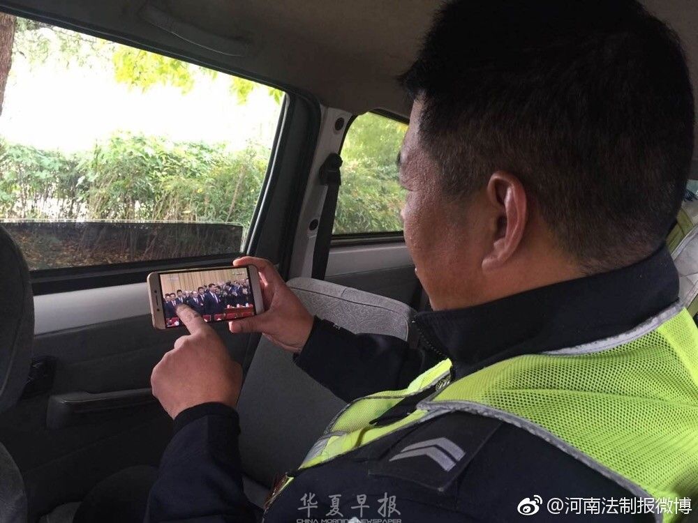 10月18日上午,河南商丘交警在执勤点通过手机收看十九大开幕会。