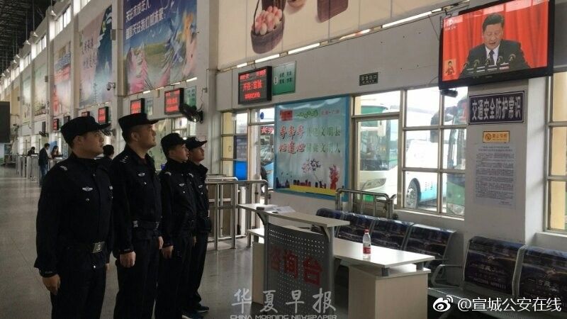 10月18日上午,安徽省宣城民警在坚守岗位的同时,运用各种方法克服“困难”,坚持收看收听开幕会。