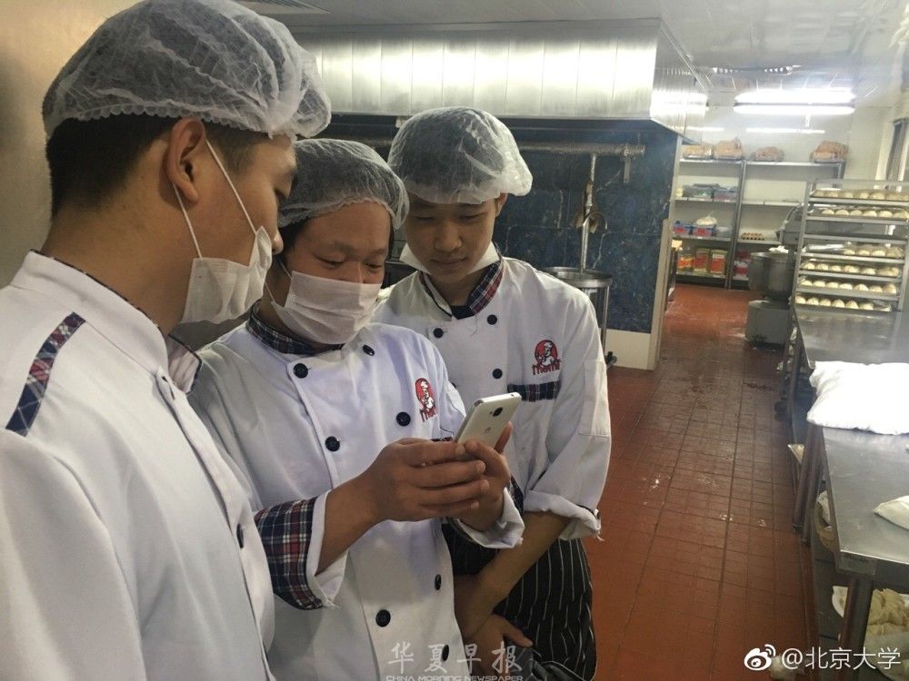 10月18日上午,北京大学的食堂工作人员一起观看十九大开幕会直播。
