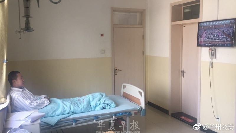 10月18日上午,兰州市公安局安宁分局值班期间受伤民警薛凌在病房观看党的“十九大”开幕会直播盛况