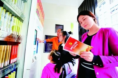 安徽省肥东县街头的自助图书馆,当地群众自助借阅党的十九大报告辅导读本。许庆勇摄/光明图片