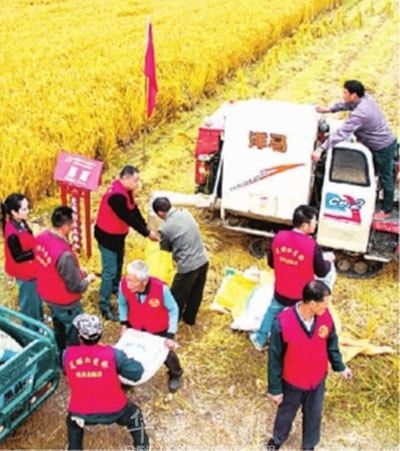 浙江省长兴县虹星桥镇罗家村的十九大宣讲队走进稻米基地,一边宣讲,一边帮助群众抢收晚稻。谭云俸摄/光明图片