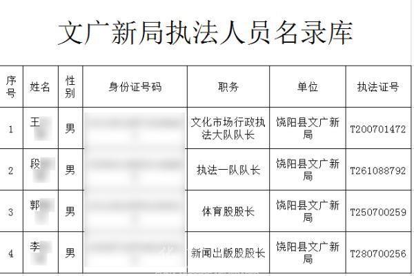 例如,饶阳县文广新局于2017年9月1日在上述专栏公开了《文广新局执法人员名录库》(索引号56323291-3/2017-2256400),该文件就详细公布了该局执法人员的姓名、性别、身份证号、职务、单位和执法证号等完整信息。