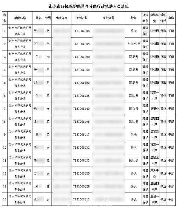 再比如,景县环保局2017年10月13日在发布了《衡水市环境保护局景县分局行政执法人员清单》(索引号40476674-X/2017-2269976)。该文件详细公开了该局行政执法人员的姓名、性别、出生年月、执法证号、身份证号、职务、执法类别、执法科室、编制性质和身份等多处完整信息。