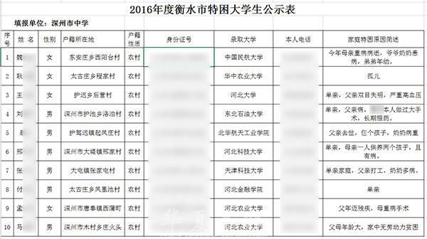 衡水市下辖县级深州市教育体育局2016年8月24日在上述公开专栏内发布了《深州中学2016年度特困大学生公示表》。这份文件将公示特困大学生的姓名、性别、户籍所在地、户籍性质、身份证号、录取大学、本人电话、家庭特困原因简述等信息完整公开。