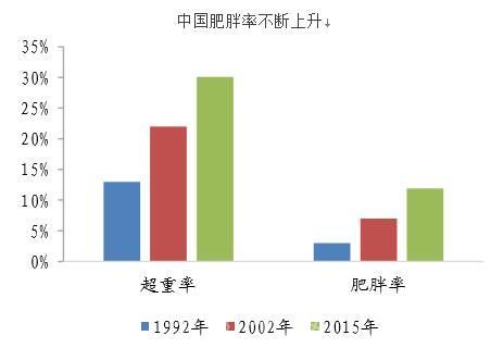 另一方面,根据国家统计局和国界卫计委的数据显示,中国人的超重率和肥胖率均不断上升。从1992年到2015年,超重率从13%上升到30%,肥胖率从3%上升到12%。