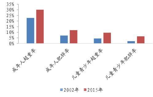 同时中国儿童和青少年的肥胖率也在快速增加,从2002年到2015年,儿童和青少年超重率从4.5%上升到9.6%,肥胖率从2.1%上升到6.4%。