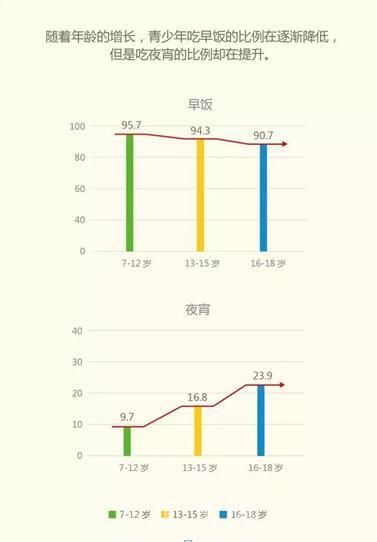 2、吃夜宵的比例却随年龄增长而提升:7-12岁青少年吃夜宵比例只有9.7%,但16-18岁青少年则高达23.8%。