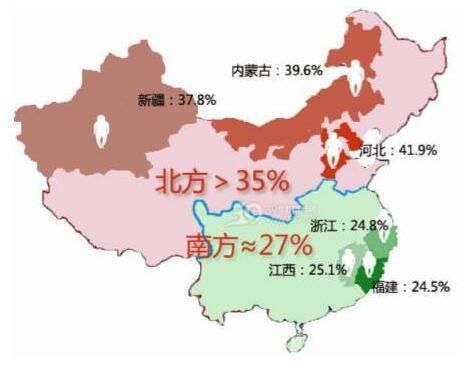 根据2015年中国肥胖指数,从地域上来说,北方肥胖指数35%高于南方27%。