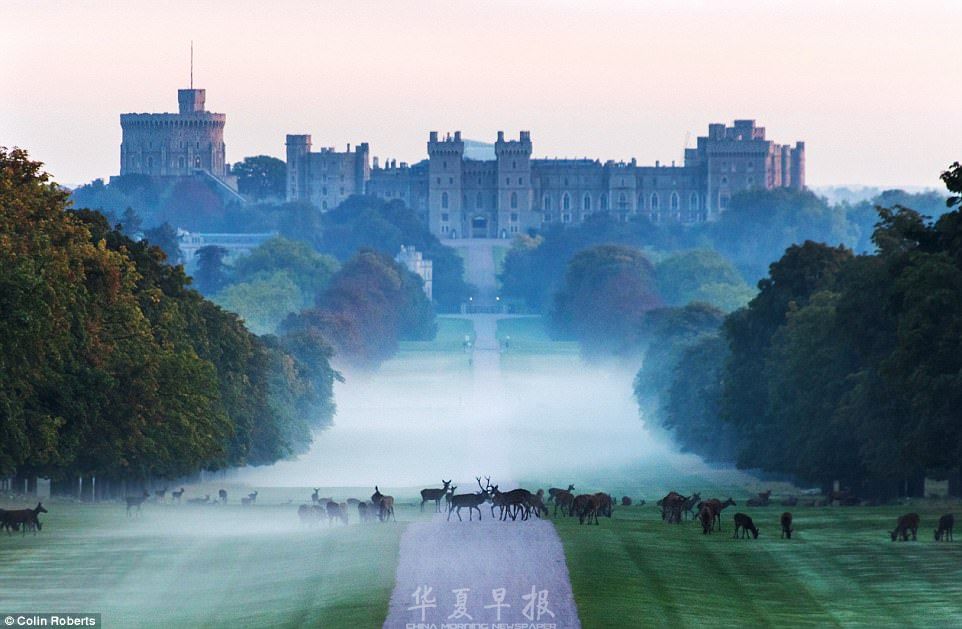 清晨,鹿群聚集在风景如画的公园里,在远处的温莎城堡笼罩着一层薄雾,这就像童话故事里的画面。