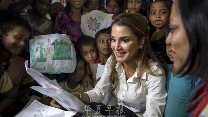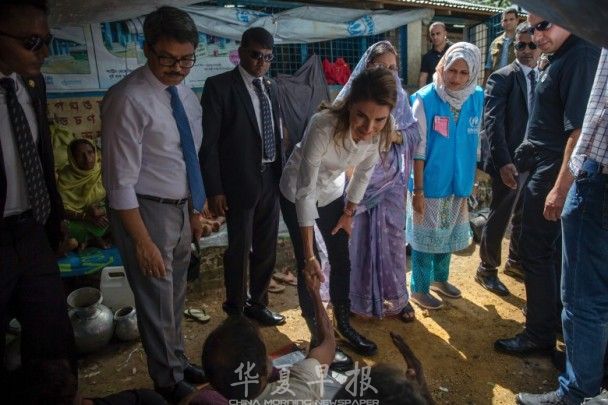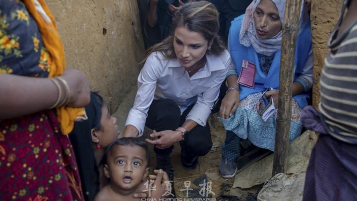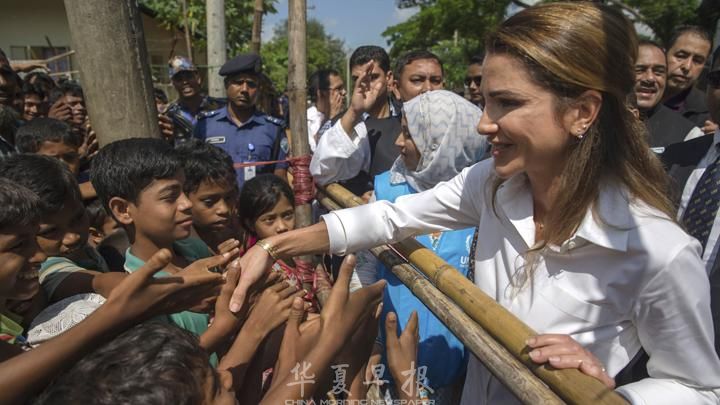 孟加拉当地时间10月23日约旦拉尼娅王后访问孟加拉境内的罗兴亚人难民营,探访缅甸罗兴亚难民,强调国际应介入危机帮助难民。