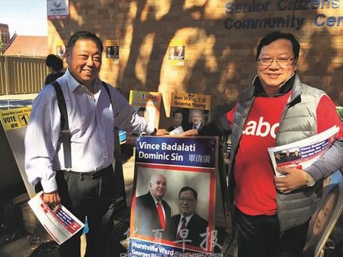 竞选当日,新州上议员王国忠为党候选人单伟广打气,(澳洲新快网)