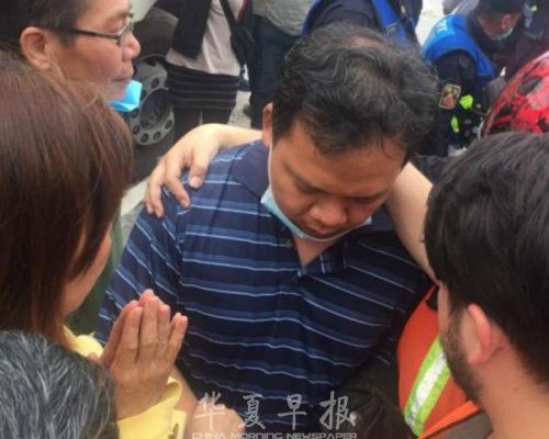 图为王家妤丈夫听到妻子获救时,众人向前拥抱。(图片来源:台媒)