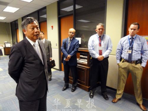 李强民(左)从休斯敦飞到亚特兰大对李案表达关切,并与警方交涉案情,右起为警探瑞奇、警督布鲁克、休斯敦领事葛明本、参赞周振成。(美国《世界日报》/吴炳宏 摄)