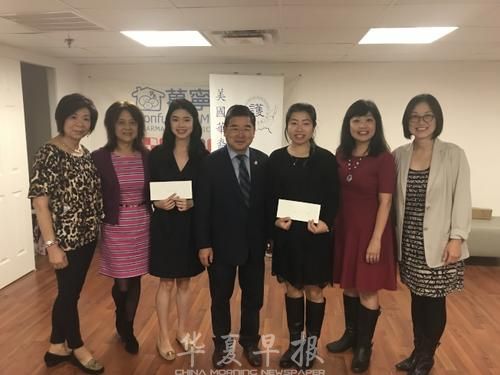 李素英(左三)和李晓璐(右三)获2017年美国华裔注册护士协会奖学金。(美国《世界日报》/记者 牟兰摄)