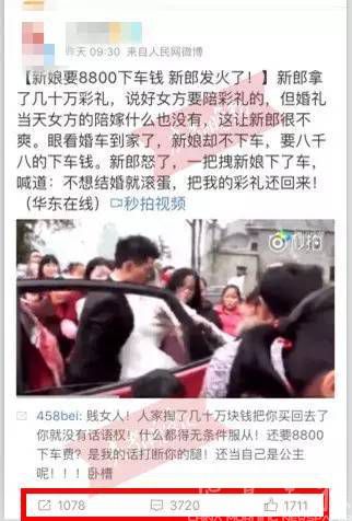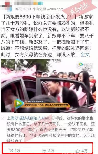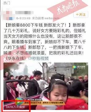 “婚礼是一件喜庆的事情,通常婚礼上新郎都不敢开罪新娘。但今日这场婚礼却显得有些分外,婚车到达要下车的一会儿,新郎发火了,对新娘拳打脚踢……”成都晚报(微信号:CDWanBao)记者打开这一段时长为1分18秒的视频看到,视频画面并未标明时间、地点、人物等具体信息,模糊的画面仅配有一段女声旁白,旁白内容异常火爆,包含“新郎对新娘拳打脚踢”、“几十万彩礼被丈母娘藏起来给新娘弟弟用”、“新娘索要8800元下车费”、“不愿意成婚滚蛋,把我的彩礼还回来”等充满矛盾、戏剧化的元素。该视频经全国各大媒体转发报道后,迅速引起网友热议,大多网友站在了新郎的一方,指责新娘及其家人:“娘家人也是够恶心了,这是卖女儿吗?”