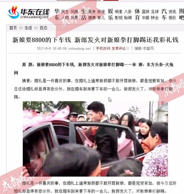 成都晚报记者梳理该条新闻报道发现,大多数转发的媒体来源标写为“华东在线”,成都晚报记者搜索看到,华东在线于6月9日下午在其网站上发布了一条名为《新娘要8800的下车钱,新郎发火对新娘拳打脚踢还我彩礼钱》的新闻,来源显示为东方头条—火兔网。百度百科显示,华东在线是南昌某网络传播有限公司旗下一家综合类资讯网站,成立于2010年。