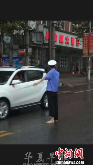 中新网平顶山7月18日电(吴扬 霍现伟) 近日,河南平顶山网友的朋友圈被一组交警冒雨光脚执勤的照片刷屏了,照片上一名光着脚的警察冒着大雨神情专注地指挥着过往车辆,途经司机翘指称赞。