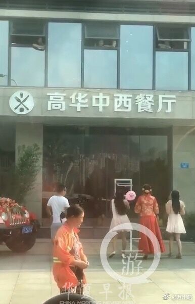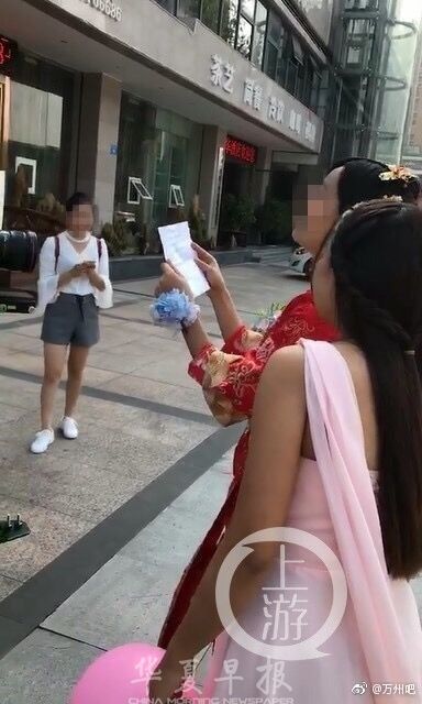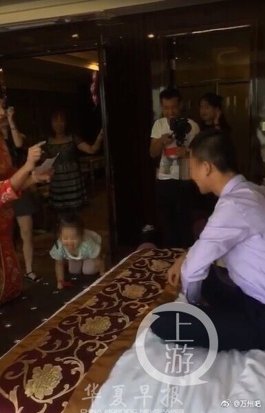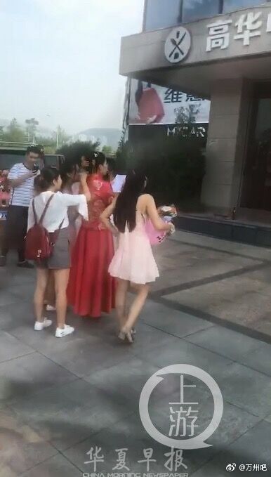 画面显示,9月15日上午,在万州江南新区南滨路一酒店门口,穿着中式婚服的新娘与伴娘在酒店门口通过跳舞、宣读保证书等重重考验,迎接新郎。