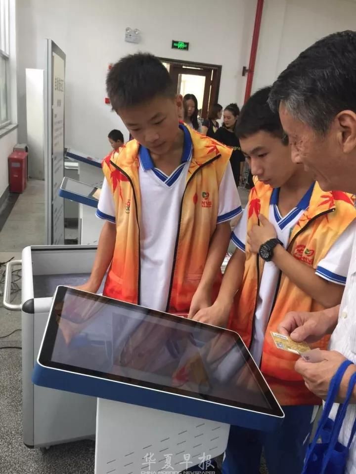 孩子们在湖南省图书馆教老年读者使用电子查阅机器。