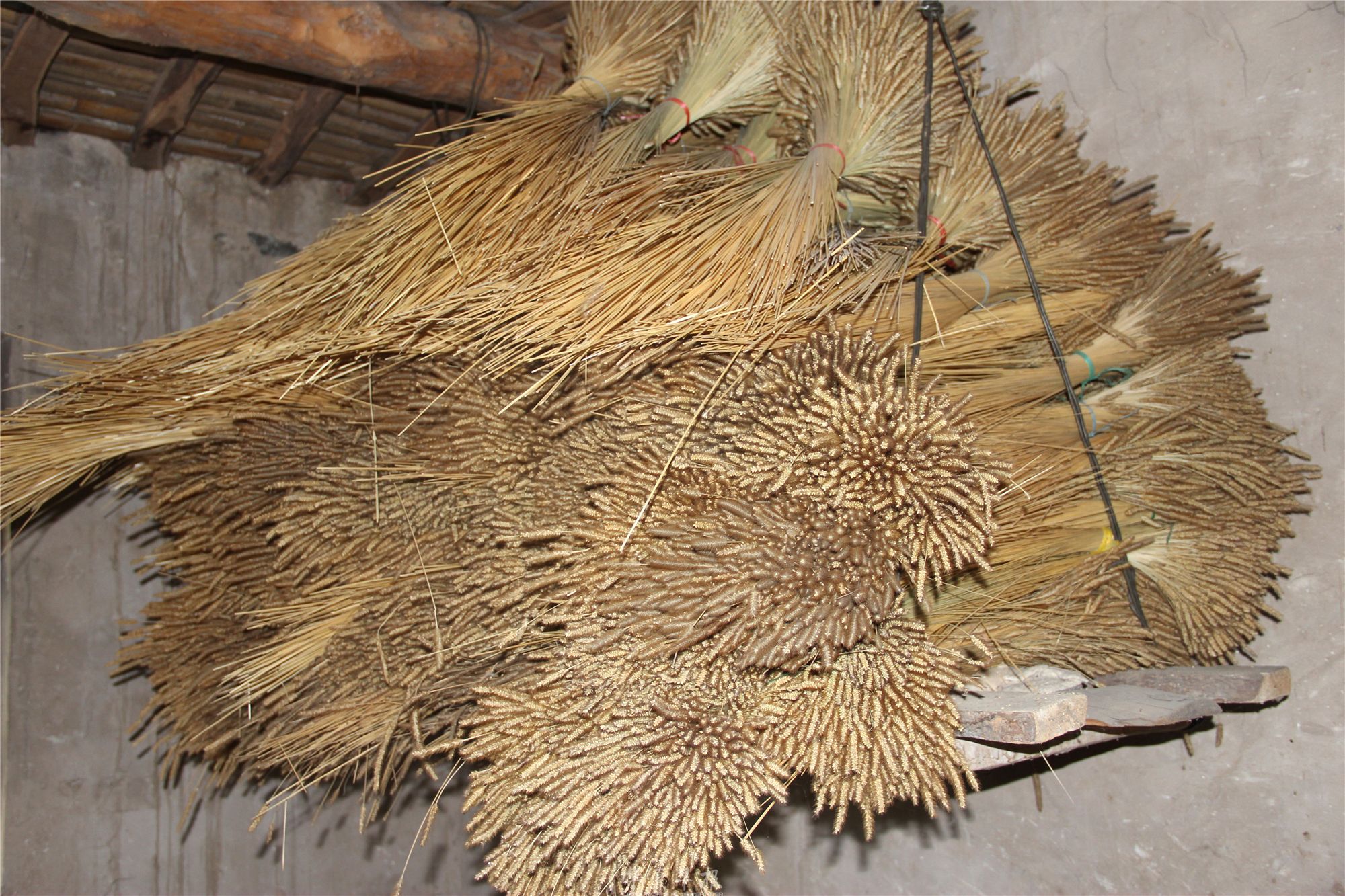吴要全从事草编之初,也受到过挫折,要么是选用的草型不合适,要么是工艺不适合,编出来的作品粗糙,不美观,老吴自己都不满意,随着一次次的试验,草编材料最终确定为狗尾巴草,这种草取材方便,最方便使用,也不容易折断。多年来,老吴除了在家编织外,抽空就到田地里、渠沟旁薅狗尾巴草,现在他家里二楼的阁楼上积攒了好多好多这样的草。