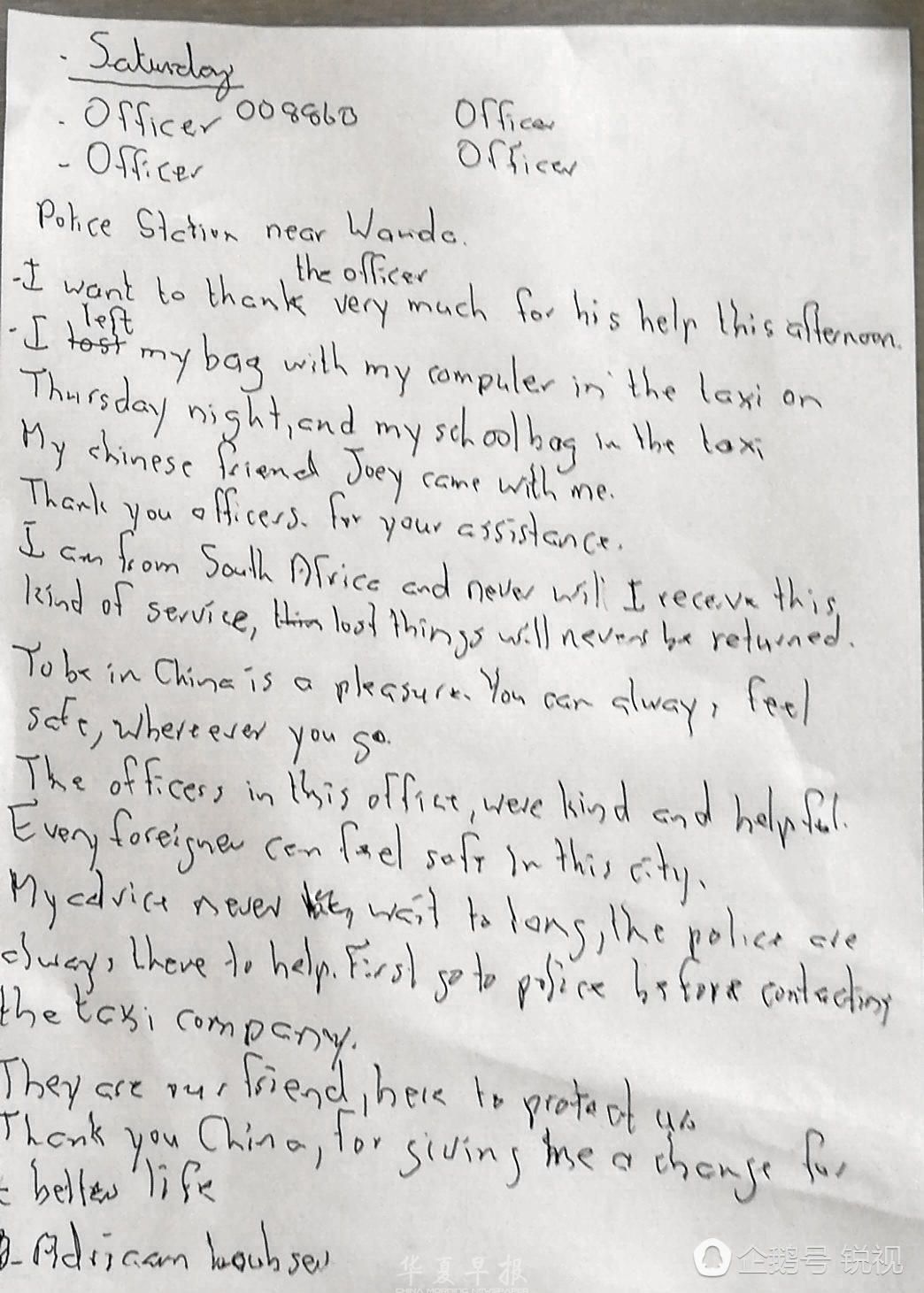 Adrlaan Loubster拿出纸笔,当场用英文写下了一封感谢信,信中说:“thank you officers for your assistance。(感谢警察同志的帮助)every foreigner can fell safe in this city”(每一个外国人都在这个城市感到了安全)。图片由石家庄裕华公安分局提供。