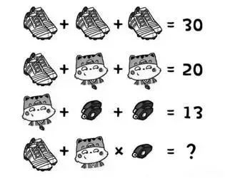 这道在朋友圈和微信群里热转的题目是一张图片,里边有四个算式,等号左边没有数字而是一些具体的物品,等号右边除最后一个算式外都有具体的得数,题的意思就是让学生通过分析和运算前三个算式,从而得出最后一个算式等号后边的数。