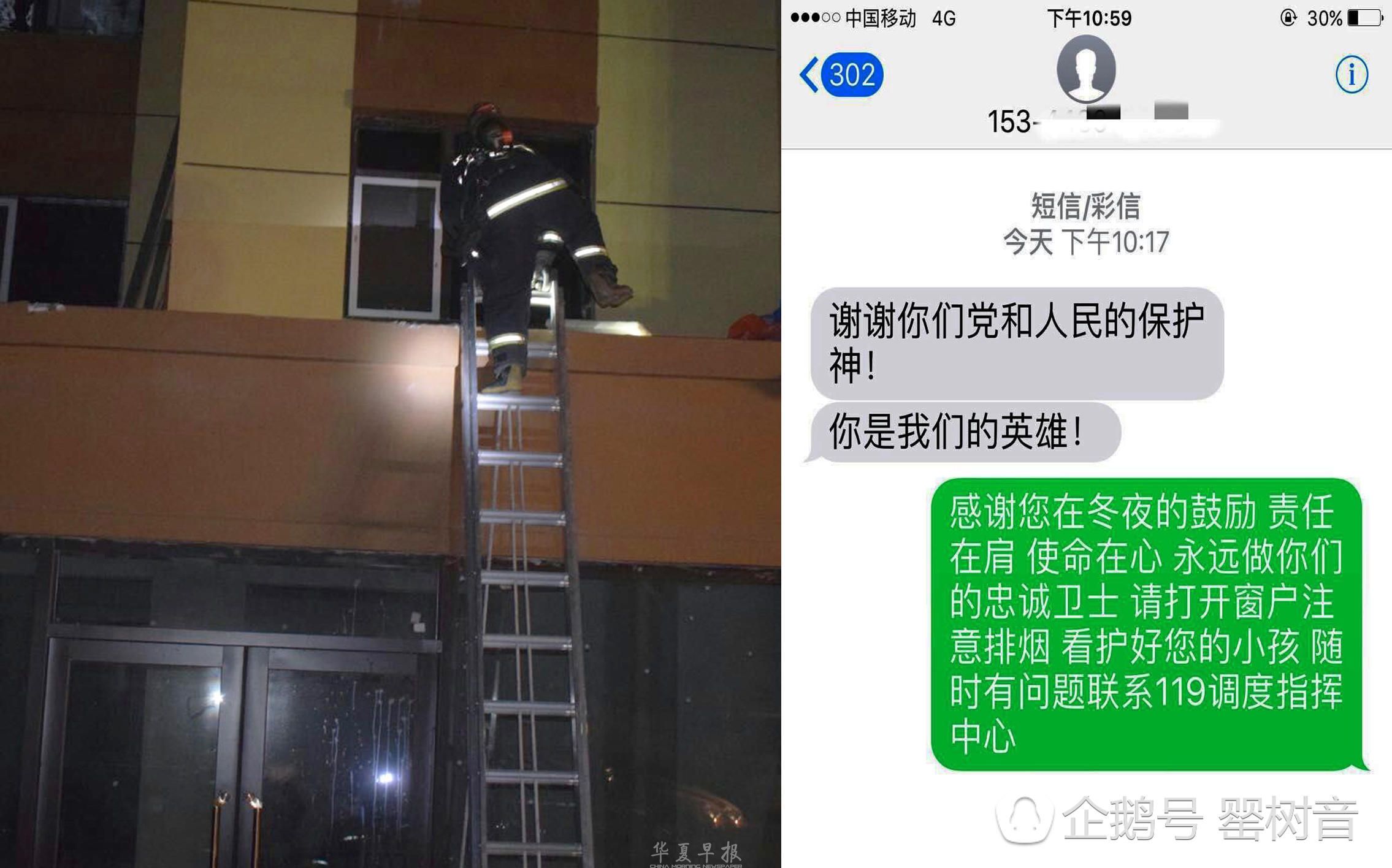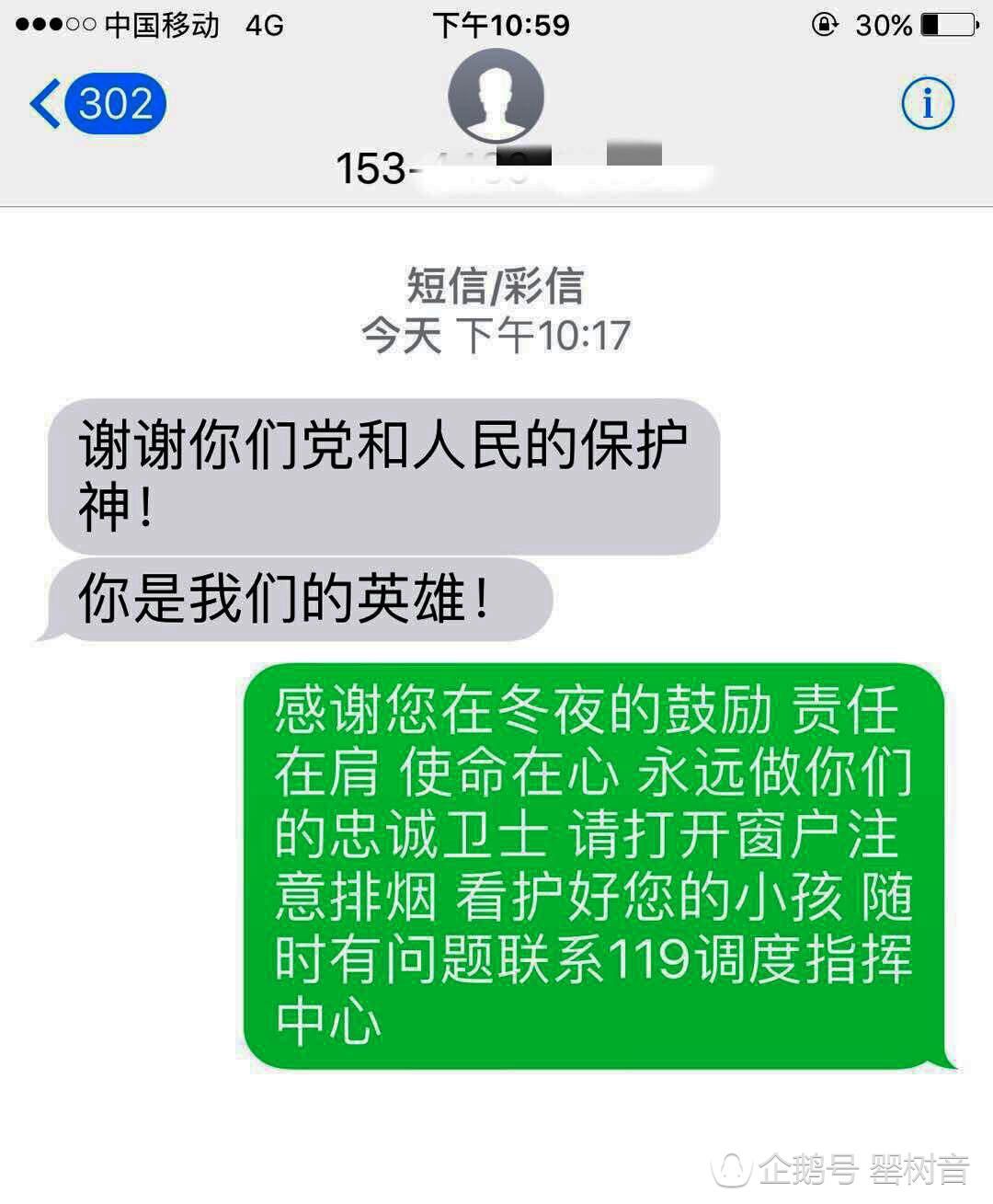 为防止破拆正门时发生轰然,决定对外窗进行破拆进入实施扑救。3分钟后,现场处置完毕,内攻组打开所有门窗对屋内实施排烟。此时,发现楼上有居民从楼梯下楼,楼道内又充满大量烟气,出于考虑楼内住户人身安全,命令楼外主战驾驶员利用车载扩音器向楼上喊话,楼内战斗员在封闭楼梯间进行引导疏散。经现场反复排查确认无事中队返回。在返回途中,业主发来了一条暖心的信息,这条短信息深深的温暖了奋战在冬夜里的基层消防官兵的心。