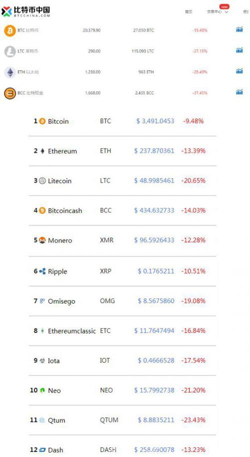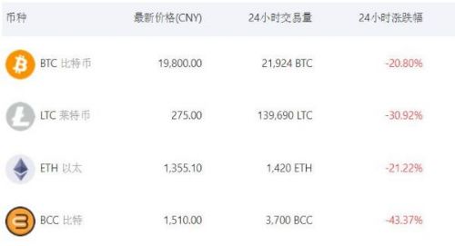 随后,该平台上的交易者疯狂抛售数字货币资产,致使数字货币人民币交易价狂泻。比特币一度大跌32%,莱特币一度大跌57.3%,比特币现金一度暴跌72.32%。