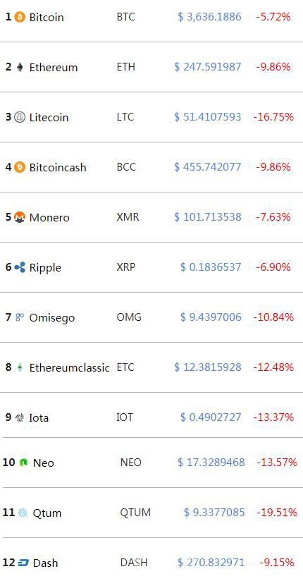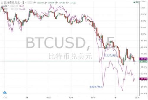 Bitstamp数据显示,周四美国交易时段,比特币交易价一度逼近3250美元,日内跌幅约为16%,以太币一度接近220美元,跌约20%,莱特币最低跌至46.28美元,日内跌幅约为25%。