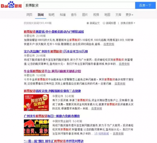 想知道配资公司拉客户的心情有多强烈?以“股票配资”为关键词在百度的新闻栏目下搜索,各大配资公司的广告铺天盖地: