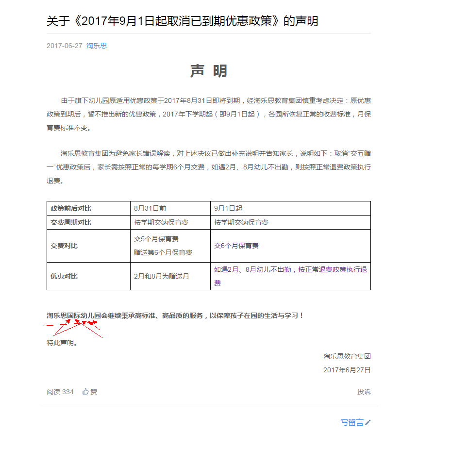 因为淘乐思的文字游戏而遭到侮辱的家长们,正甩给园方一记重重的耳光! 真实情况是,没有哪个家长支付不起那每年多出来的七八千元,家长们正在用行动告诉你:什么叫公平?什么叫规则?什么叫底线?坚守你自己认为的“公平”,将失去口碑、失去信任、失去在这个市场立足的根本。