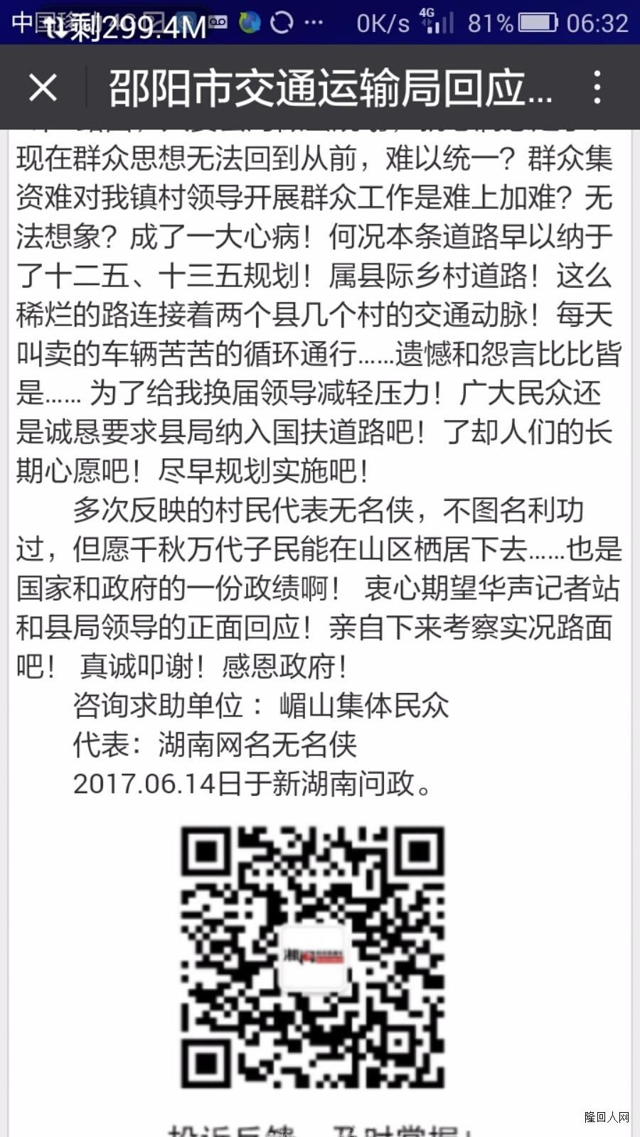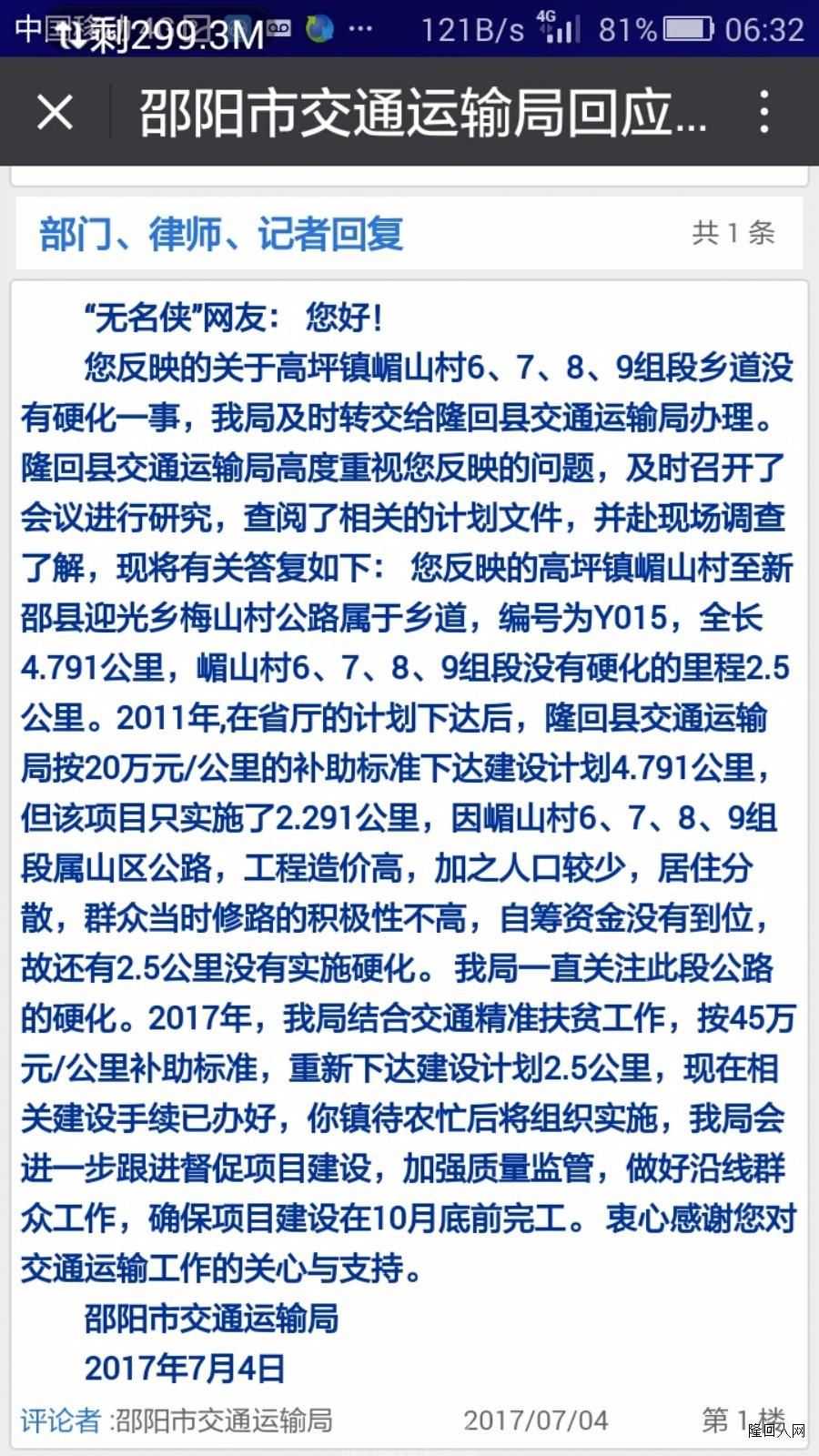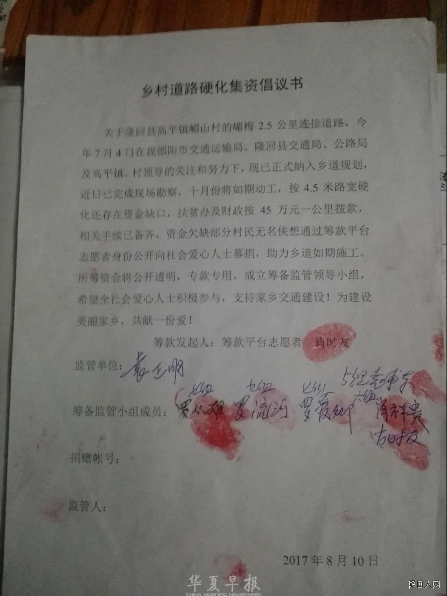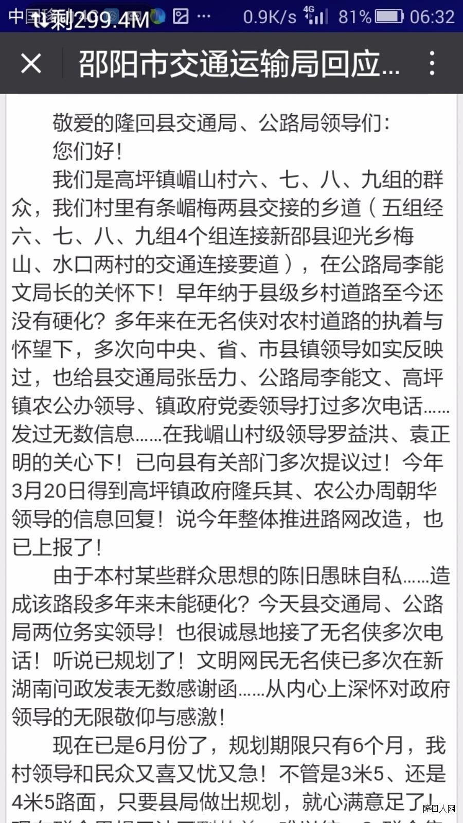 关于隆回县高坪镇嵋山2.5公里交接道路,在我邵阳市规划局丁常明、隆回县交通局张岳力、公路局李能文等领导的无限关怀下!终于今年7月4日已正式纳入乡道硬化路面之中!今天我隆回县交通规划运输局测绘员在高坪镇领导刘小飞及村级领导的陪同下!不顾高温酷热,亲临5、6、7、8、9组段进行现场堪查测绘工作!全程2.5公里,由扶贫办及交通局按3米5路宽,财政拔款45万每公里下拔资金,于十月份动工实施!如群众要求要按4米5路宽完成道路硬化!资金欠缺部分,,无名侠网友想将通过筹款平台公开向社会爱心人士自愿捐赠,助力此路的全面实施!