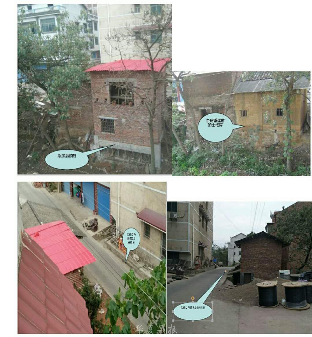 四、自渡增公路提出加宽以来,除东风村出入口马路修得只剩下2.6米了,其余地方宽8米有余,如原马路不止2.6米,那剩余的宽度哪里去了?请领导实地调查,把非法占用公有马路建筑物清除,还人民一条正常的交通要道。
