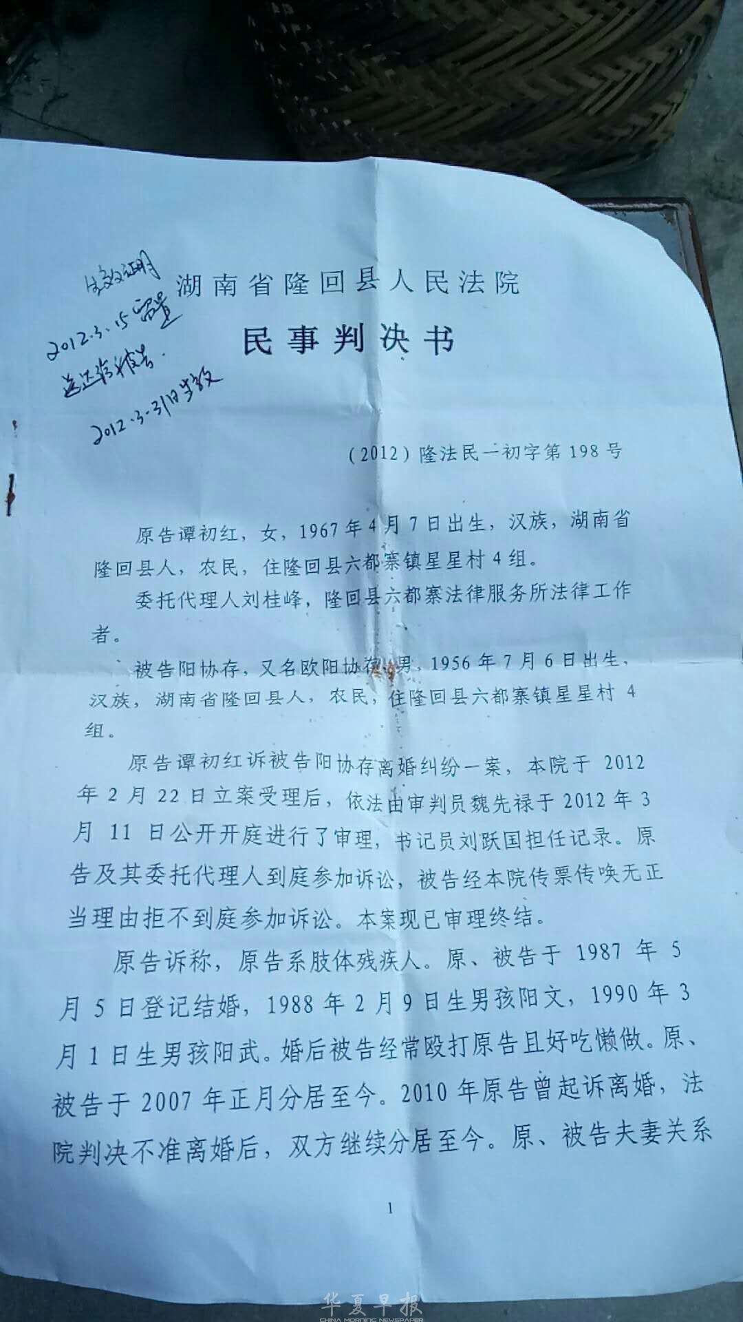 我是湖南省隆回县六都寨镇荷田乡石观音村5组村民;谭初红,女,现年50岁。 自幼一岁时患小儿麻痹症;右腿严重畸形,失去自理劳动能力;在父母的悉心照料下;终于长大成人。 于1987年嫁给本镇星星村4组的阳协群(存)为妻;于1988年和1990年分别生育后了两男孩;由于身体生理上的缺陷,加上丈夫好吃懒做;不顾家庭积钱;对家庭子女没有责任心?经常打骂侮辱我,剥夺妇女权益……在家庭婚姻破裂的处境下,我舍痛丢下幼小的亲生骨肉;于2012年向当地人民法院提出离婚诉求后;判决后于2014年11月27日将户口迁回娘家原地(本镇石观音村五组);一无所有?我父母双双快80岁高龄;父亲叫译谭绍全;母亲叫刘珍玉;身弱多病;再无法承担一个残疾女儿的生存生活;两儿子因户口没在我一起;大儿子阳文也29岁了;至今未成家?小儿子阳武27岁了虽已成家,都是在外公外婆的关怀下!接受教育;现都在南下打工谋生;生活只能自保;无力承担一个已离婚的亲生母亲的晚年生活? 想到这些;我常常夜不能寝;想以死了之!但看着年迈的双老及两个亲生的儿子;我又从绝望中重新燃起对生命的渴求! 在社会主义改革开放不断发展的今天;国家和政府不断完善农村贫困群众的救助政策的大好形势下!很多残疾困难家庭群众得到了国家和政府的救助!今年的蔸底帮扶民政救助脱贫新政更加完善! 我又充满对生活的阳光向往;重新激起生活的勇气! 今特前来请求上级人民政府及当地民政部门领导,视特殊情况,实事求是,来人来访,调查核实!为我解决一个弱女子晚年的生活归宿!过完自己的人生春秋! 我相信政府领导看了我的处境后,一定会同情赠助! 求助人:谭初红;身份证号码43262219670407376x;电话:15243994651。 呈上叩谢!不幸感激!