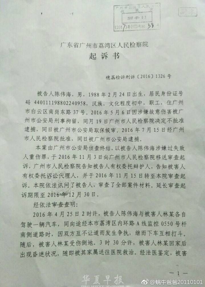 事情发生在2016年4月25日凌晨2时16分,《被害人林执》开车接客户牛志玉从广州市白云机场回佛山市,在内环路被《凶手陈伟海》驾车超越,并以危险方法驾驶车辆来抓弄被害人林执,(即在林执车前急刹车,然后随林执向左而转左向右而转右,不时突然急刹车),故意堵住道路不让超车,后来到达广州市荔湾区内环路A线监控0550号杆南侧道路时,双方持平,下窗互骂,即时下车,陈伟海拿出方向盘锁,林执不知其携带凶器,就下车与陈伟海争吵结果被陈伟海正面抡起方向盘锁一击击中林执头顶及右脑靠近耳部位置,当时导致林执右耳朵出血及后脑右侧伤口出血,林执惨叫一声倒地,客户牛志玉也下车,见到林执被击倒上前与陈伟海缠打结果被击伤眼部,林执被扶起后,陈伟海不知道事态严重,仗着自己在公安机关的势力叫来交警,交警到场后发现不是交通事故,也不按法律程序处警呼叫医院120到事故现场救治处理林执头部的损伤就劝双方和解,当时证人牛志玉神志清醒状态,就下车去告知交警林执头上的伤是被陈伟海拿方向盘锁打的,但交警拒绝,不准予证人牛志玉下车当面对质讲清楚双方打架的事,(反而利用被害人打架的过错来吓唬被害人,说要抓被害人去派出所关押,逼迫被害人讲不是打架),当时被害人林执的意识神志迷糊不清状态,觉得可能没事加上客户也在场,就糊里糊涂地听从交警双方和解离开了现场。当林执到达南海区黄岐汉庭酒店在柜台办理牛志玉入住手续时,当时已经因伤重不能回答服务员的问题了,2分钟后林执回到离酒店500米的家中就失去语言能力了,家属发现急忙送去大沥医院抢救,至今无法苏醒成为植物人。