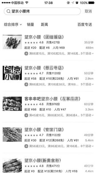 外卖平台上多家“望京小腰”