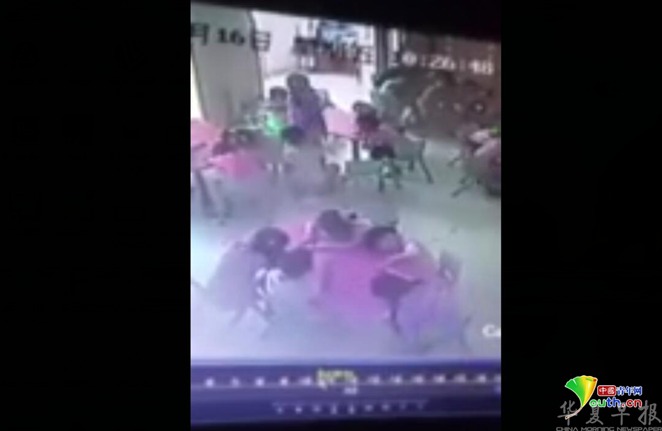 另有一段监控视频显示,幼儿园教室里,一名男生走到一名女生面前,让女生站起来,并抽走了女生坐的椅子,随后,开始脱女生裤子。