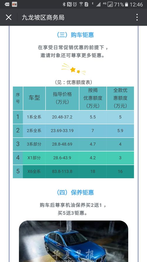 而购买宝马X6全系车辆的优惠程度最大,按揭优惠18万元,全款优惠16万元。文章末尾还附上重庆宝盛宝马大客户经理联系电话,以及九龙坡区商务局联系人的电话。