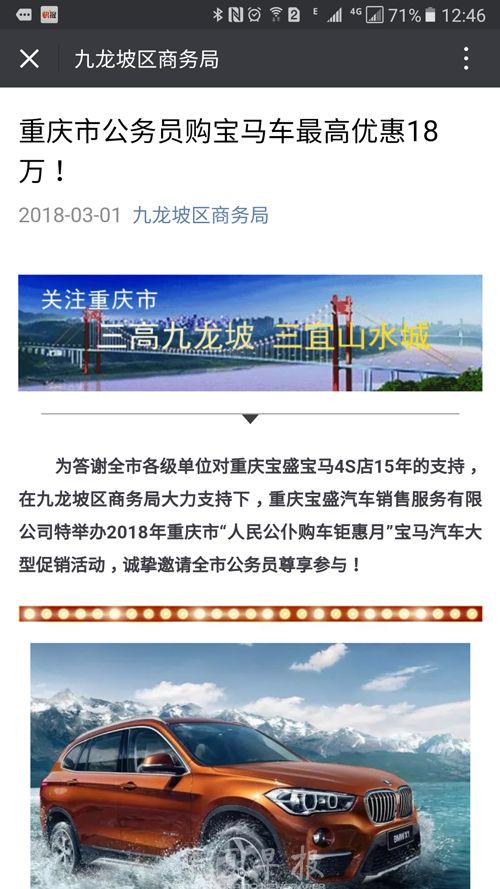 重庆市九龙坡区商务局官方微信公众号发布的公务员购宝马享优惠的文章截图。