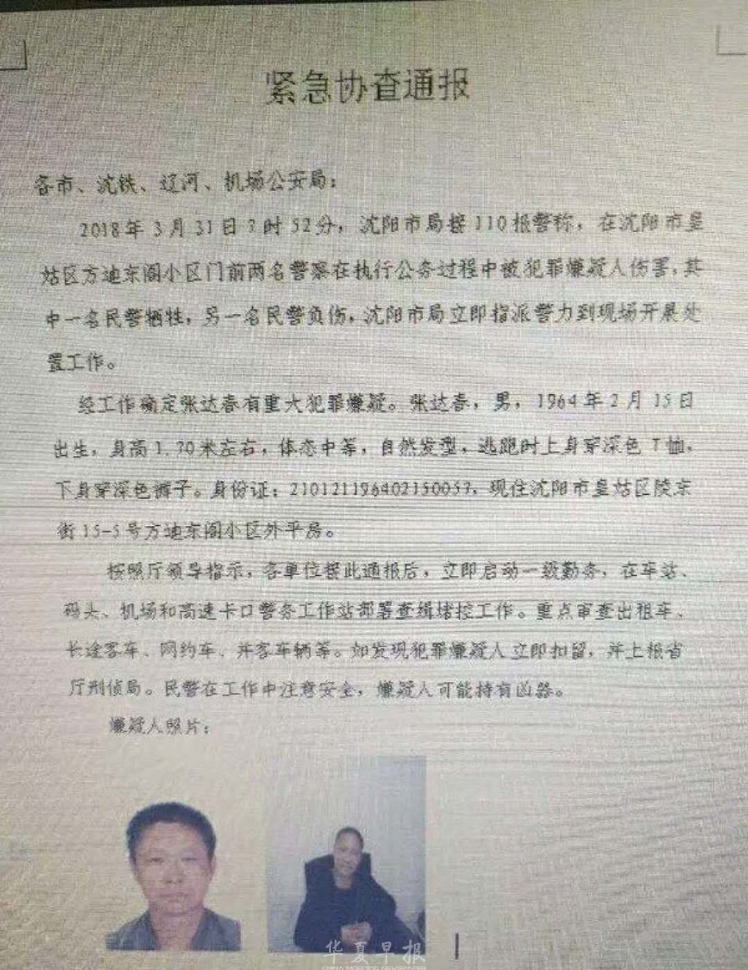 经当地公安部门调查,一名叫张达春的男子有重大嫌疑,该男子出生于1964年2月15日,身高1.70米左右,体态中等,自然发型。逃跑时上身穿深色T恤,下身穿深色裤子,其住址为沈阳市皇姑区陵东街15-5号方迪东阁小区外平房。