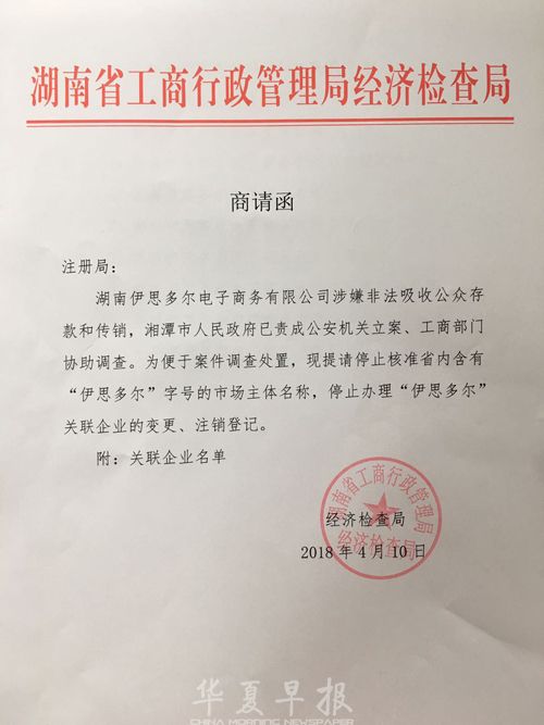 华夏早报湖南长沙讯(灯塔新闻记者 曾煜)湖南省工商行政管理局4月10日发出的一份商请函显示,湖南伊思多尔电子商务有限公司(以下简称伊思多尔)被认定涉嫌非法吸收公众存款和传销。