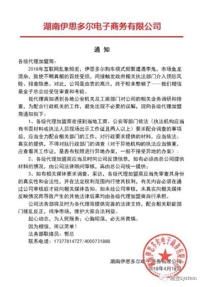 另一份伊思多尔2018年4月18日发布的通知称,2018年互联网乱象频发,间接触发政府相关执法部门介入预防风险、排查隐患。“对此,公司是由衷的高兴,终于盼来整顿了—我们相信是金子总会经受住审查和考验。”