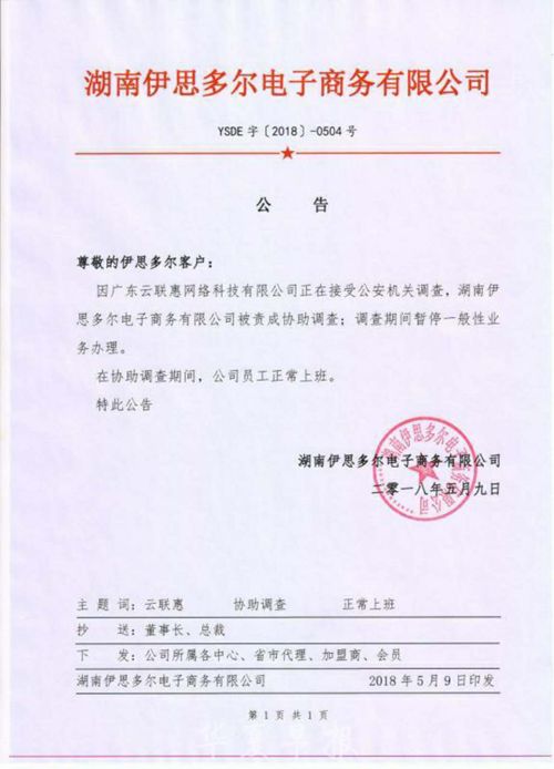 伊思多尔2018年5月9日发布的公告称,因广东云联惠网络科技有限公司正在接受公安机关调查,伊思多尔被责成协助调查,调查期间暂停一般性业务办理。该公告同时还称,在协助调查期间,公司员工正常上班。该公告抄送伊思多尔董事长和总裁,下发给公司所属各中心、省市代理、加盟商和会员。