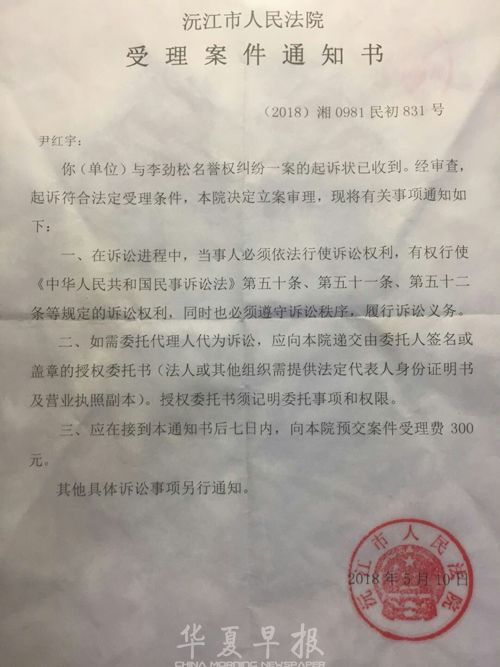 沅江市人民法院在2018年5月10日出具的受理案件通知书中表示,“你(单位)与李劲松名誉权纠纷一案的起诉状已收到。经审查,起诉符合法定受理条件,本院决定立案审理。”