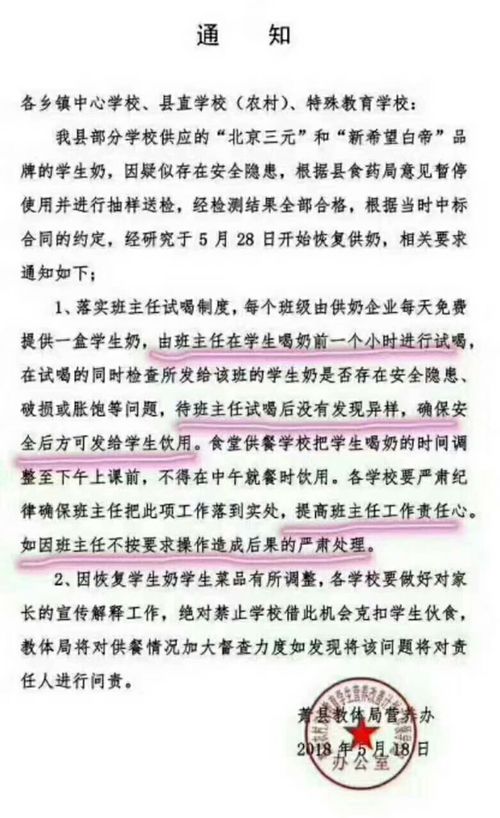 该通知还称,根据当时中标合同的约定,经研究于5月28日开始恢复供奶。该通知要求,落实班主任试喝制度。“由班主任在学生喝奶前一个小时进行试喝,待班主任试喝后没有发现异样,确保安全后方可发给学生饮用。”该通知还要求,“各学校要严肃纪律确保班主任把此项工作落到实处,提高班主任工作责任心。如因班主任不按要求操作造成后果的严肃处理。”
